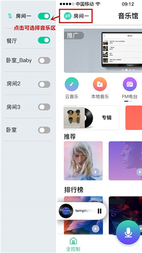 呼叫對講更簡單。在音樂播放界面,可以直接點擊語音對講圖標,選擇相應房間開啟語音對話,不在同一個房間也能交流無阻。