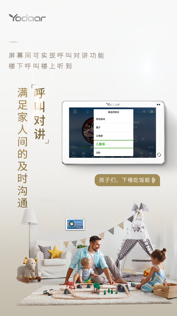 事實上對于別墅、復(fù)式樓等居住空間比較大的家庭來說,當家庭成員在各自房間時,很容易因空間阻礙影響溝通效率。而中控屏的呼叫對講功能就能完美解決這一問題,無論家人在哪個房間,通過屏幕就能對話,隨時溝通。