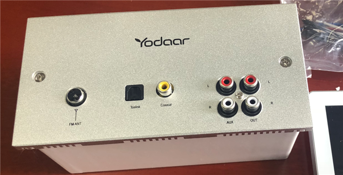 功放有點(diǎn)分量,磨砂金屬材質(zhì),摸起來很有質(zhì)感,正面的接口從左到右依次為:本地FM、光纖(Toslink)、同軸(Cosxial)、 外接AUX、輸出OUT。
