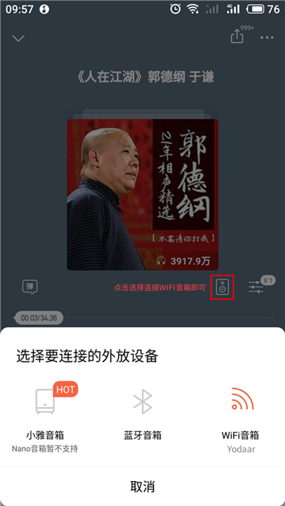 下載完之后就可以返回首頁,隨便點(diǎn)擊你想聽的節(jié)目,通過界面上的按鈕連接外部設(shè)備,系統(tǒng)就能同步播放啦~其他音樂軟件的設(shè)置也類似,網(wǎng)易云音樂是打開DLAN設(shè)備,QQ音樂是打開QPlay,大家可以去試試。